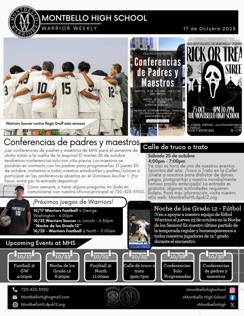 ¡Las conferencias de padres y maestros de MHS para el semestre de otoño están a la vuelta de la esquina! El martes 28 de octubre tendremos conferencias solo con cita previa. Los maestros se pondrán en contacto con los padres para programarlas. El jueves 30 de octubre, invitamos a todos nuestros estudiantes y padres/tutores a participar en las conferencias abiertas en el Gimnasio Auxiliar 1. ¡Por favor, entre por la entrada deportiva!
