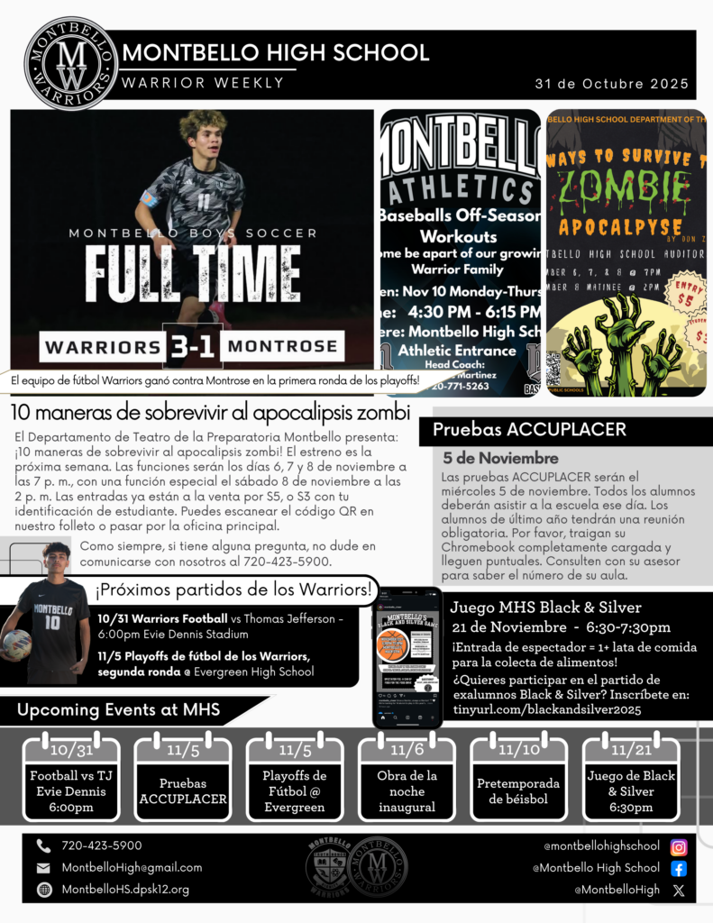 El Departamento de Teatro de la Preparatoria Montbello presenta: ¡10 maneras de sobrevivir al apocalipsis zombi! El estreno es la próxima semana. Las funciones serán los días 6, 7 y 8 de noviembre a las 7 p. m., con una función especial el sábado 8 de noviembre a las 2 p. m. Las entradas ya están a la venta por $5, o $3 con tu identificación de estudiante. Puedes escanear el código QR en nuestro folleto o pasar por la oficina principal.
