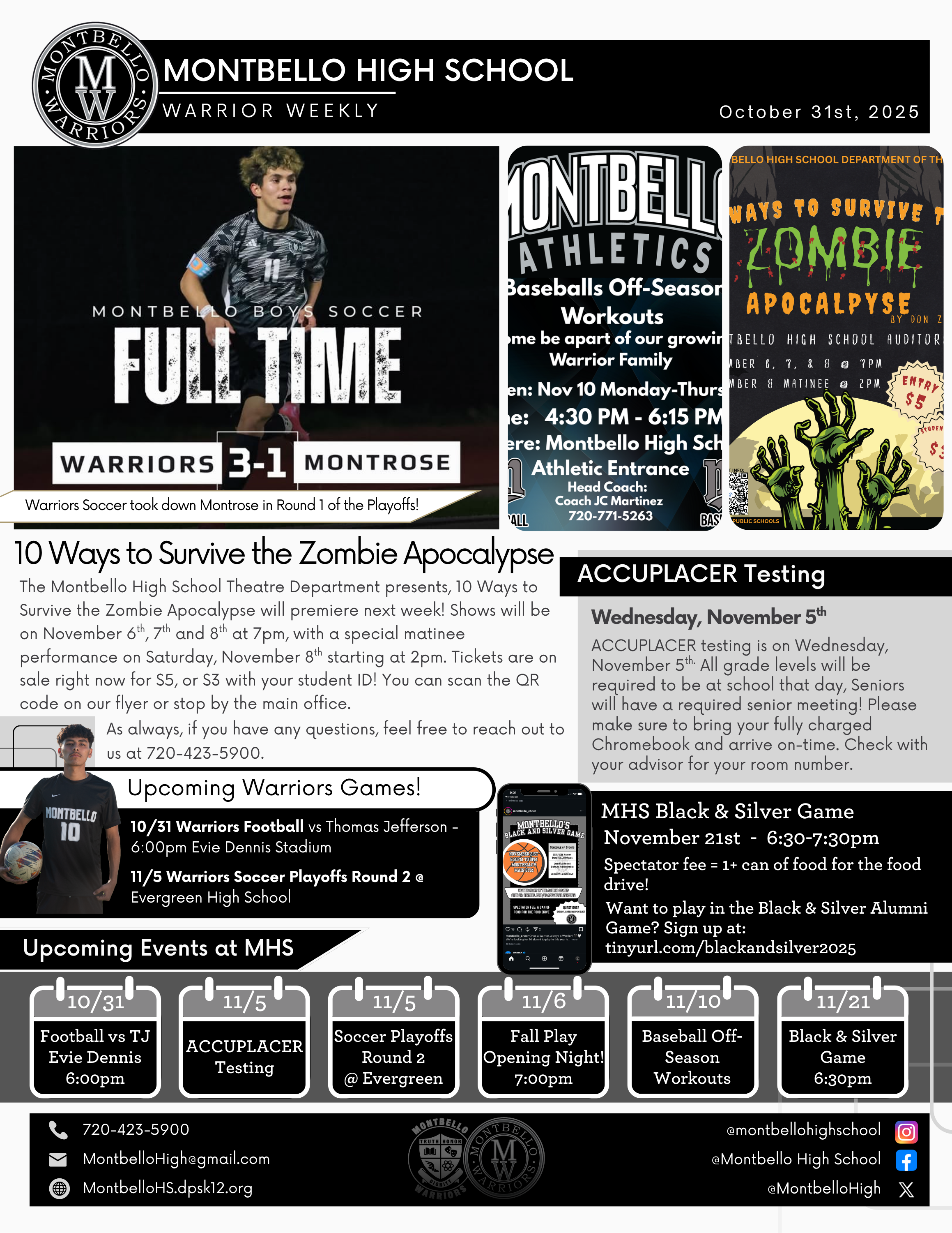 The Montbello High School Theatre Department presents, 10 Ways to Survive the Zombie Apocalypse will premiere next week! Shows will be on November 6th, 7th and 8th at 7pm, with a special matinee performance on Saturday, November 8th starting at 2pm. Tickets are on sale right now for $5, or $3 with your student ID! You can scan the QR code on our flyer or stop by the main office.