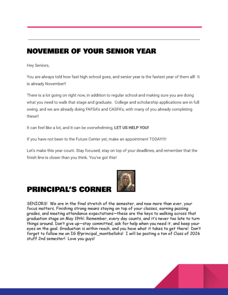 A new Warrior Monthly for our MHS seniors has been posted to the Senior Corner! The November Warrior Monthly, along with every previous edition from this school year, can be found through the ‘Student’ tab > ‘Senior Corner’.