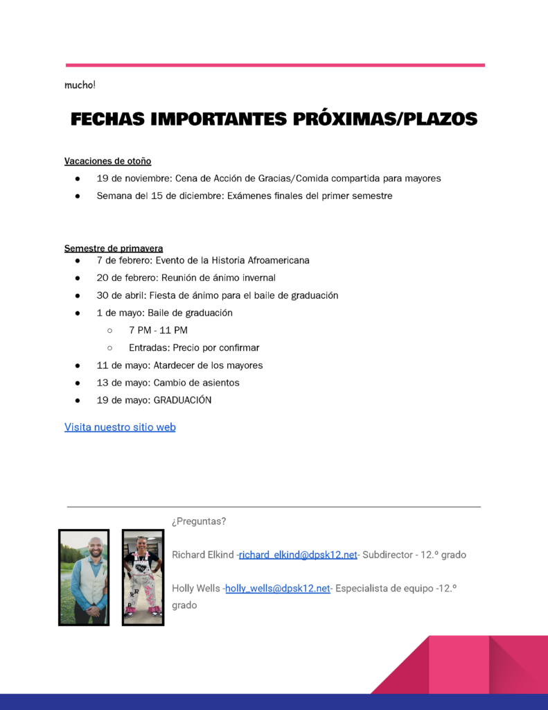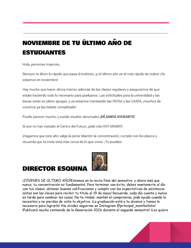 ¡Ya está disponible en la sección “Rincón del Estudiante” la nueva edición del Boletín Mensual del Guerrero para nuestros alumnos de último año de MHS! El Boletín Mensual del Guerrero de noviembre, junto con todas las ediciones anteriores de este año escolar, se puede encontrar en la pestaña “Estudiante” > “Rincón del Estudiante de Último Año”.