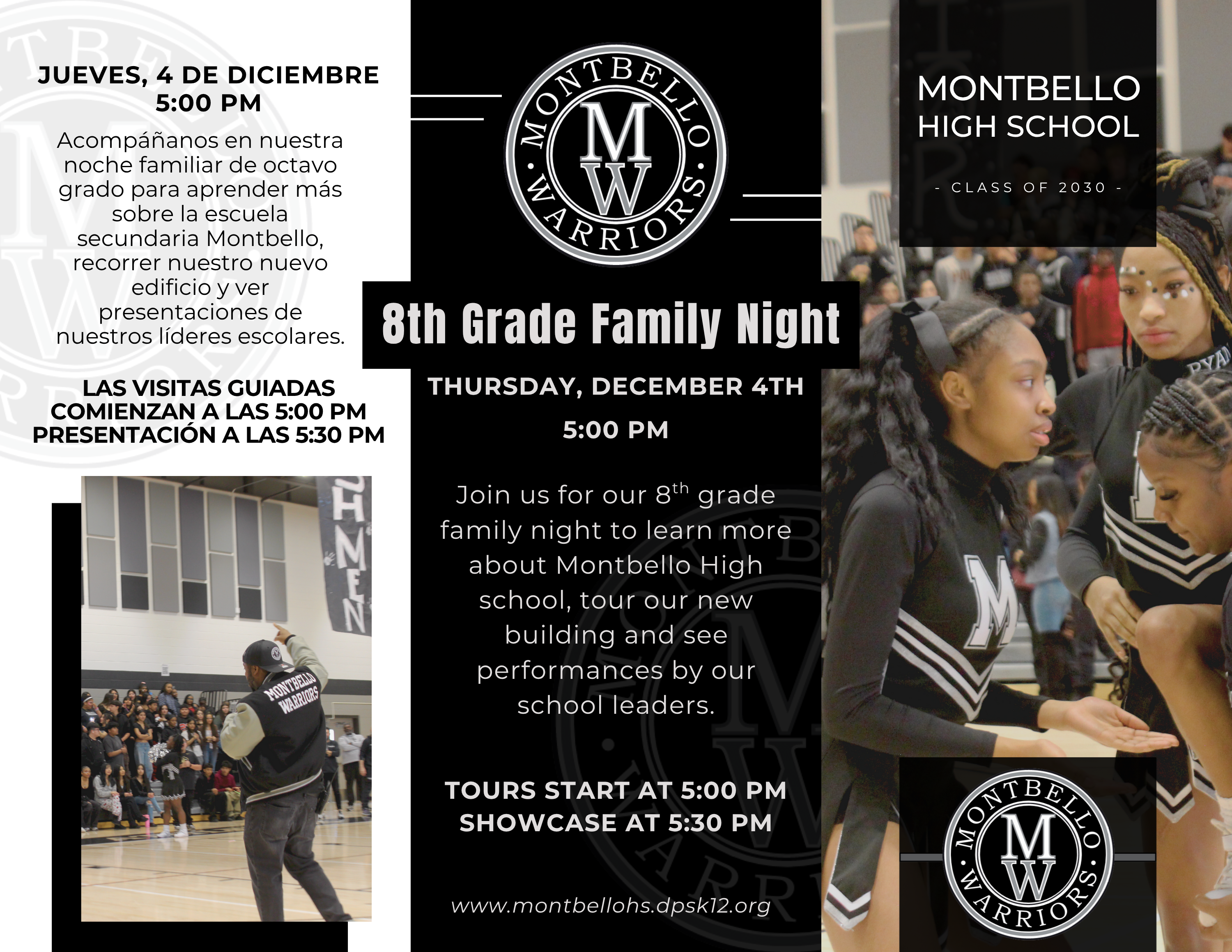 El jueves 4 de diciembre, celebraremos una Noche Familiar para estudiantes de Grado 8, dirigida a todos los estudiantes, padres y tutores interesados ​​en formar parte de la comunidad de Montbello Warriors el próximo año. Acompáñanos a las 5:00 PM para una visita guiada a nuestras nuevas y modernas instalaciones, inauguradas para el curso 2024-2025. ¡Después, disfruta de una demostración de nuestros estudiantes de Montbello Warriors sobre nuestra oferta de deportes, clubes, actividades, asignaturas optativas y mucho más!