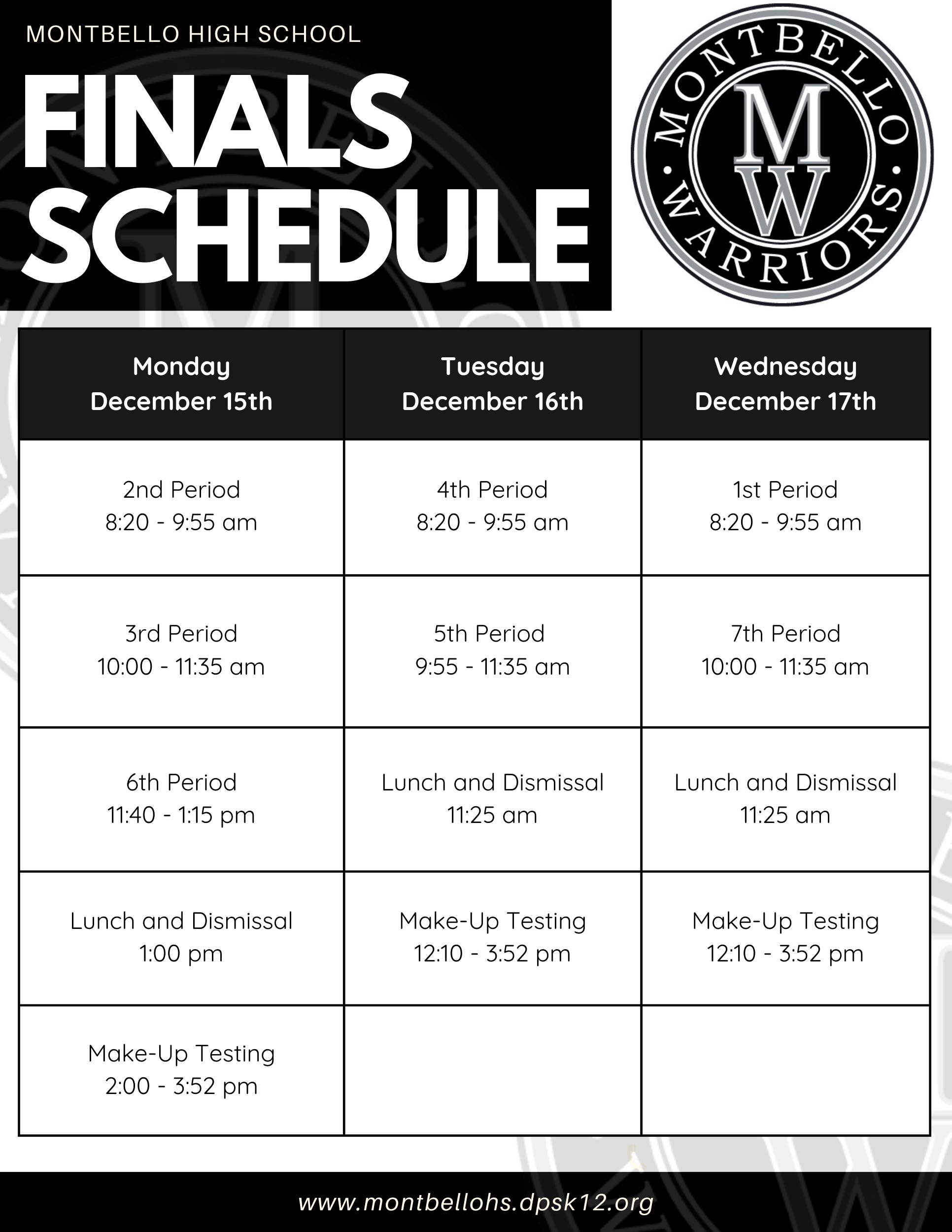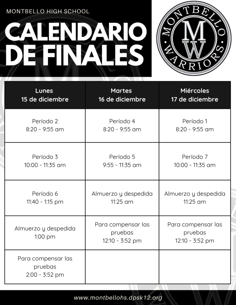 Montbello High School Finals will be on Monday, December 15th – Wednesday, December 17th.