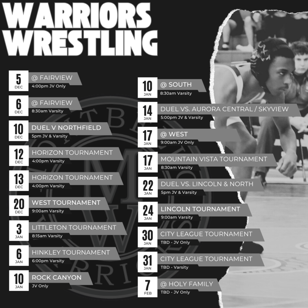 Check out our Warriors Wrestling team take on Northfield High School TONIGHT in the MHS Main Gym, starting at 5pm! This is our first home Wrestling event of the year, but MHS will be hosting two more duels this year vs. Aurora Central/Skyview and Lincoln/North. Check out our full Warriors Wrestling schedule below and come support our squad!