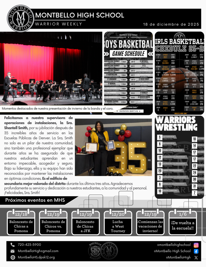 Felicitamos a nuestra supervisora de operaciones de instalaciones, la Sra. Shantell Smith, por su jubilación después de 35 increíbles años de servicio en las Escuelas Públicas de Denver. La Sra. Smith no solo es un pilar de nuestra comunidad, sino también una profesional ejemplar que durante años se ha asegurado de que nuestros estudiantes aprendan en un entorno impecable, acogedor y seguro. Bajo su liderazgo, ella y su equipo han sido reconocidos por mantener las instalaciones en óptimas condiciones. Es el edificio de secundaria mejor valorado del distrito durante los últimos tres años. Agradecemos profundamente su servicio y dedicación a nuestros estudiantes, a la comunidad y al personal. ¡Felicidades, Sra. Smith!