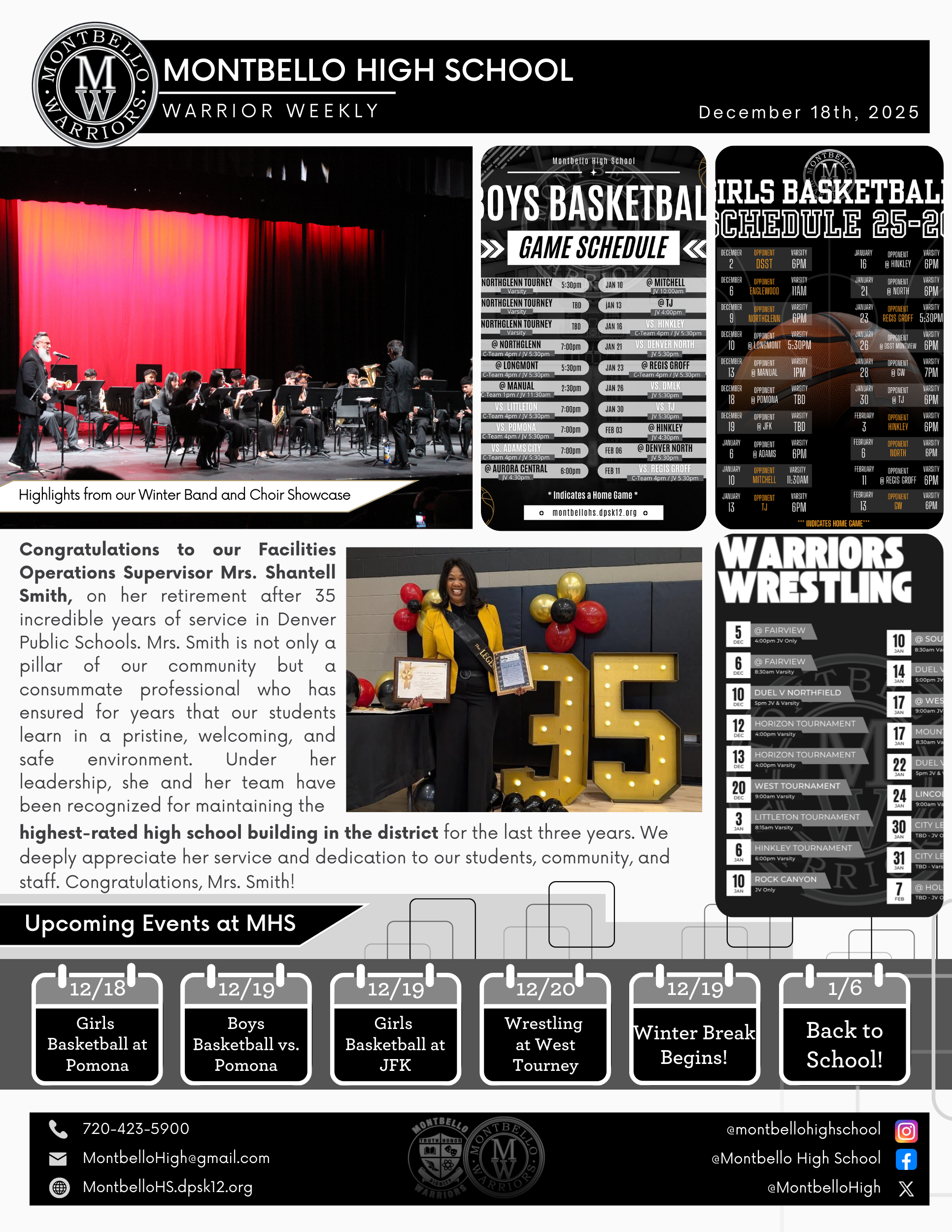 Felicitamos a nuestra supervisora de operaciones de instalaciones, la Sra. Shantell Smith, por su jubilación después de 35 increíbles años de servicio en las Escuelas Públicas de Denver. La Sra. Smith no solo es un pilar de nuestra comunidad, sino también una profesional ejemplar que durante años se ha asegurado de que nuestros estudiantes aprendan en un entorno impecable, acogedor y seguro. Bajo su liderazgo, ella y su equipo han sido reconocidos por mantener las instalaciones en óptimas condiciones. Es el edificio de secundaria mejor valorado del distrito durante los últimos tres años. Agradecemos profundamente su servicio y dedicación a nuestros estudiantes, a la comunidad y al personal. ¡Felicidades, Sra. Smith!
