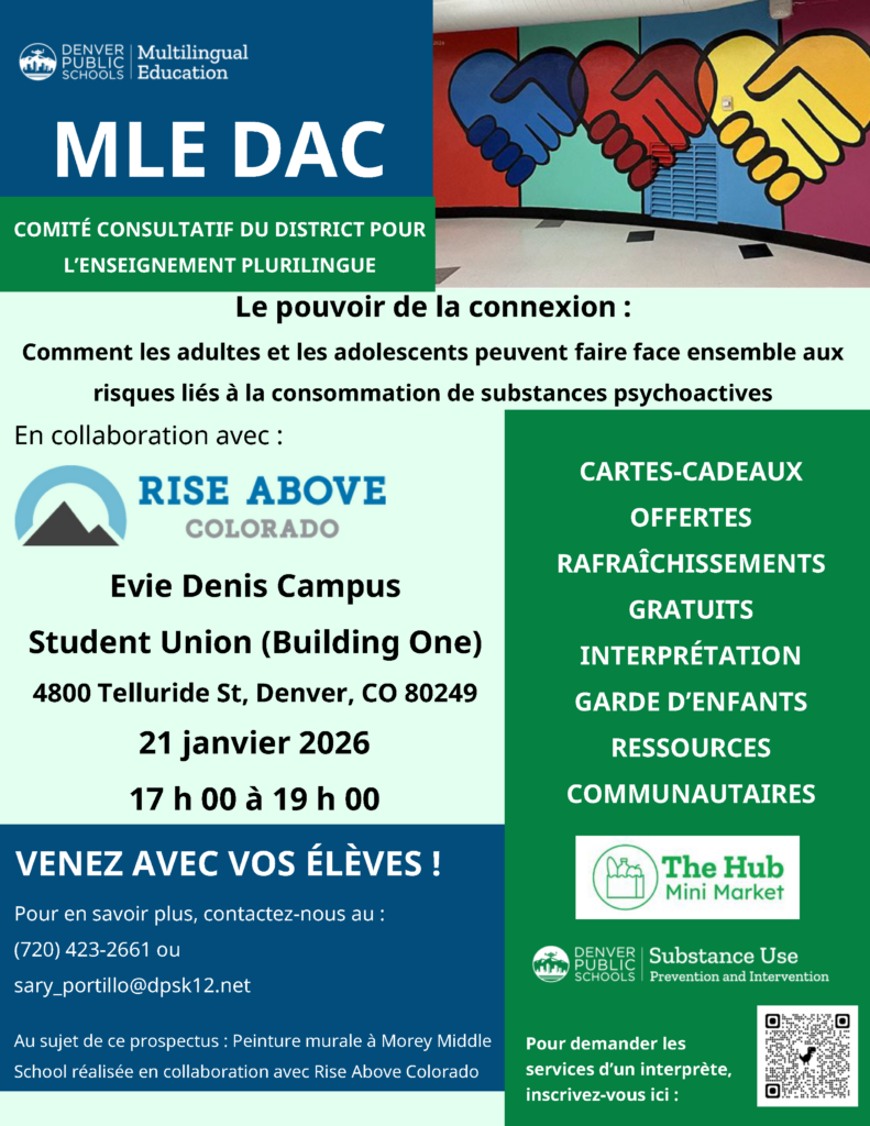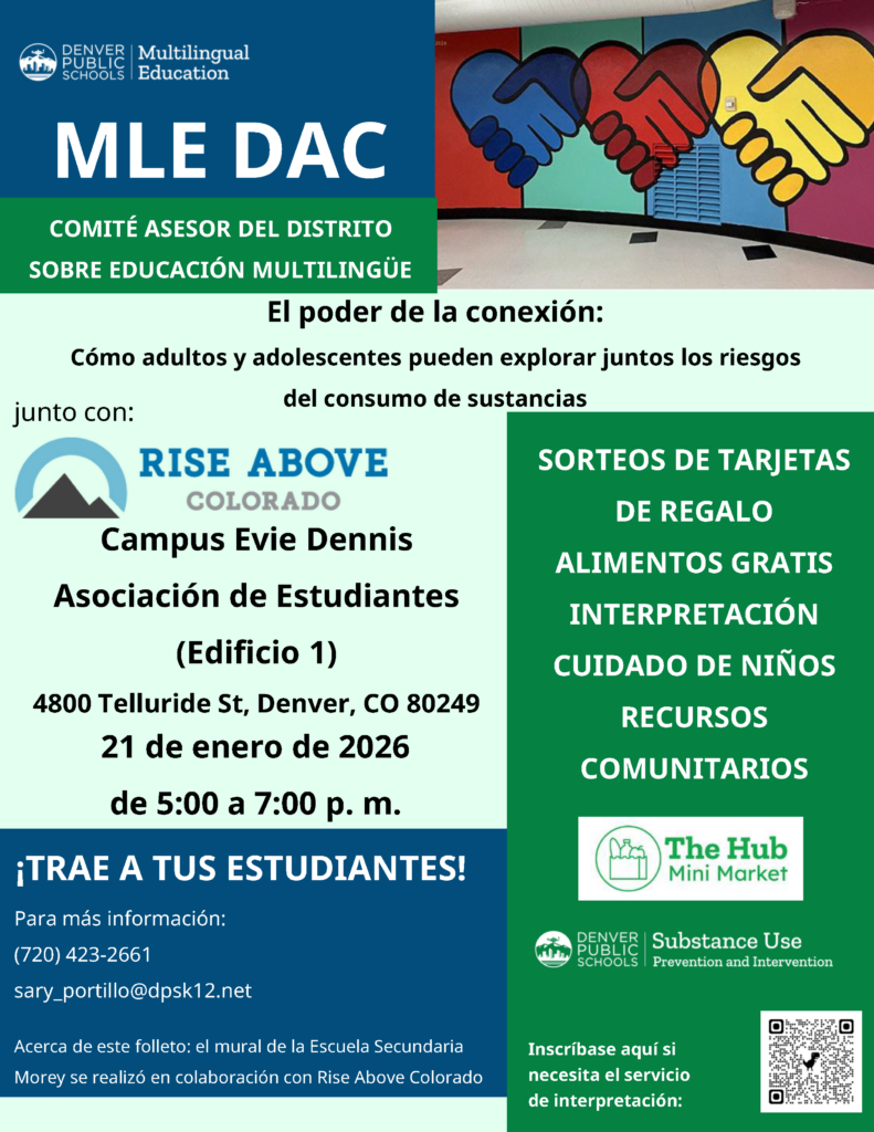 La reunión de MLE DAC se llevará a cabo el 21 de enero de 17:00 a 19:00 en el edificio del Centro de Estudiantes (Edificio Uno) del campus Evie Dennis. El tema de este mes será el abuso de sustancias y cómo abordar los riesgos con sus hijos. Habrá sorteo de tarjetas de regalo, comida gratis, servicio de interpretación, cuidado de niños y recursos comunitarios disponibles.