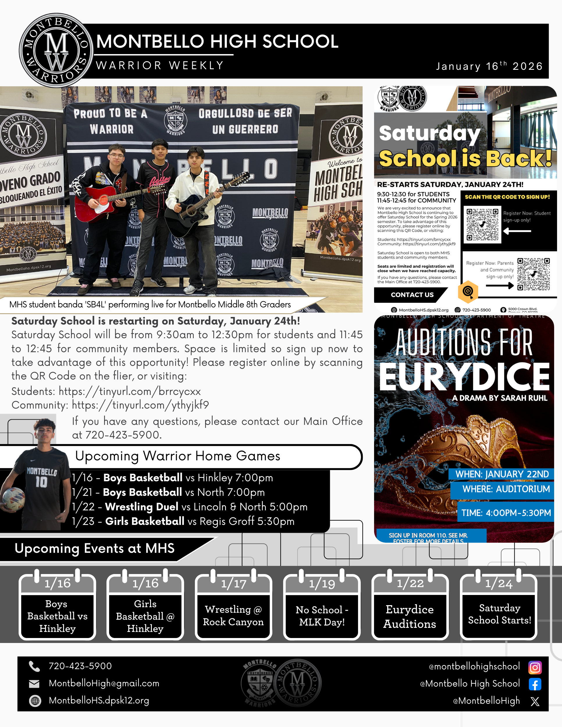 ¡Las clases de los sábados se reanudan el sábado 24 de enero! Las clases de los sábados se impartirán de 9:30 a 12:30 para estudiantes y de 11:45 a 12:45 para miembros de la comunidad. ¡Las plazas son limitadas, así que inscríbase ahora para aprovechar esta oportunidad! Puede registrarse en línea escaneando el código QR del folleto o visitando la siguiente página web: