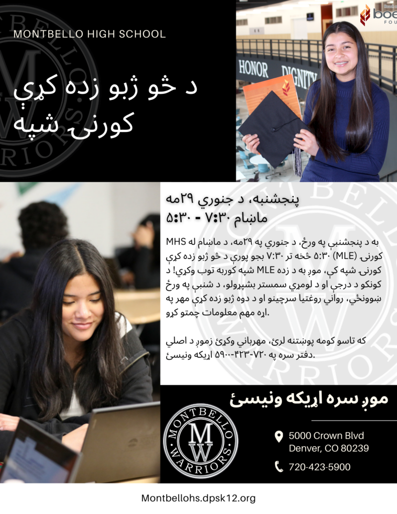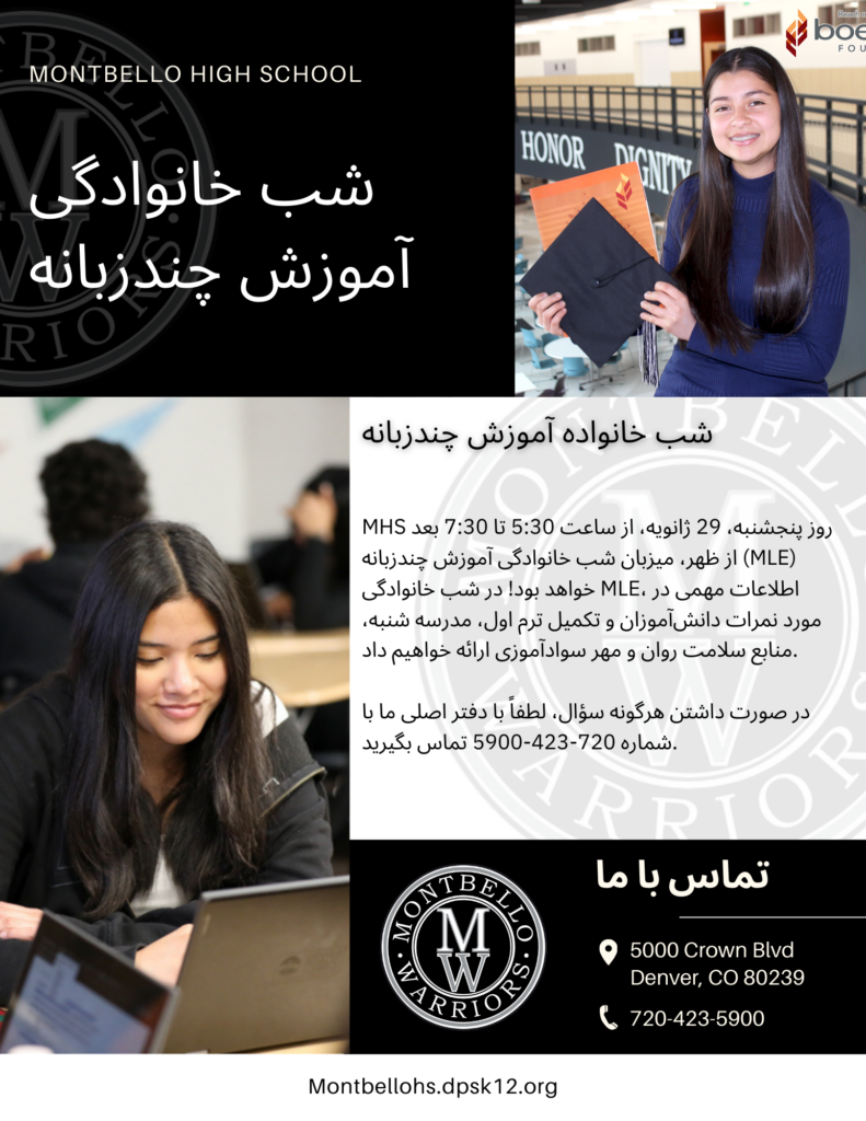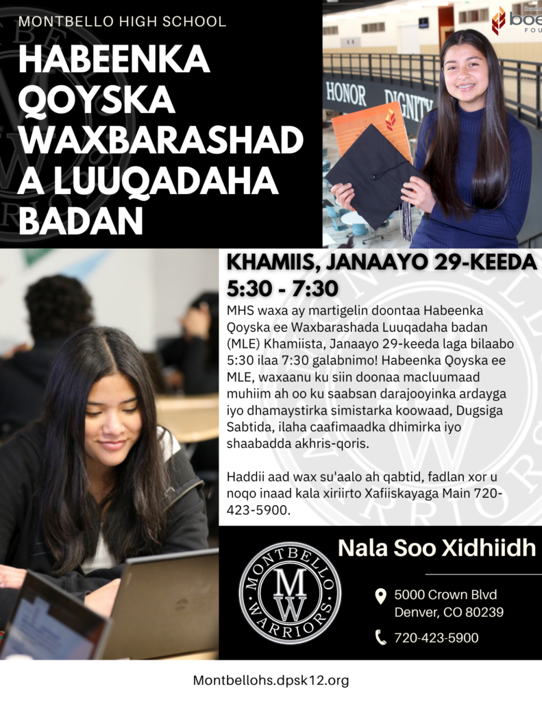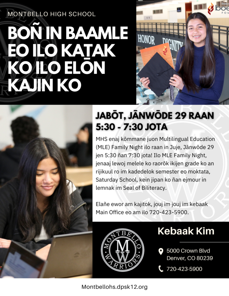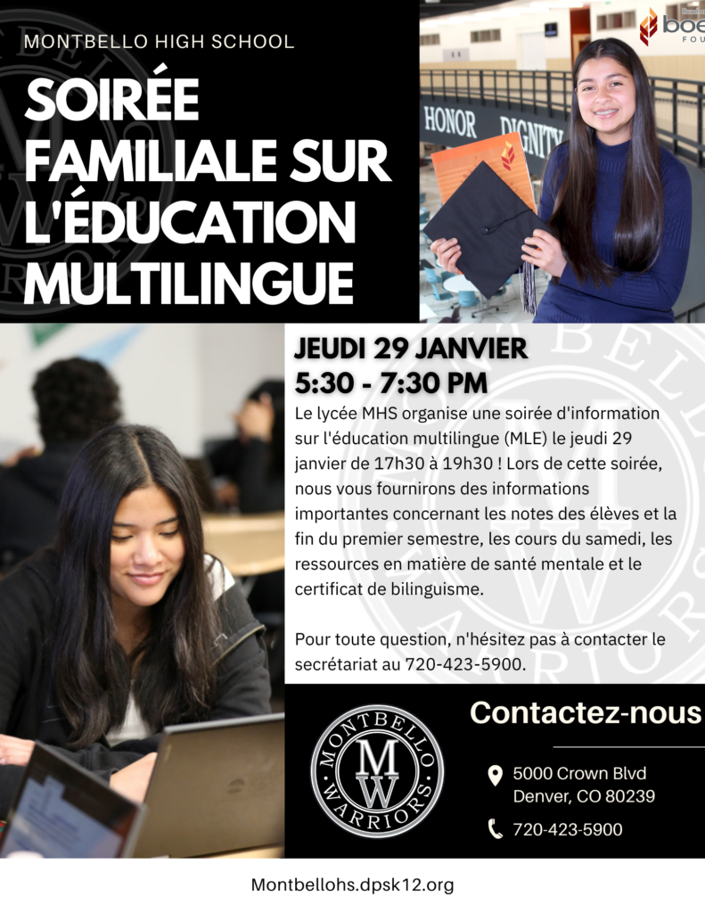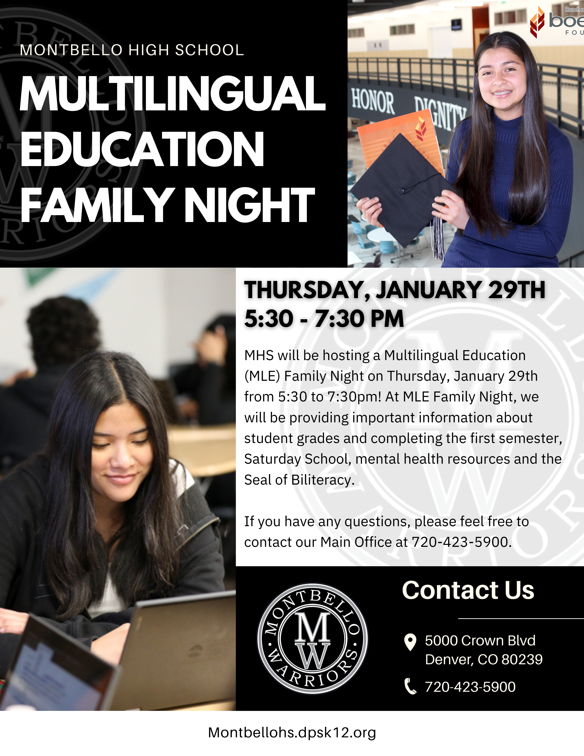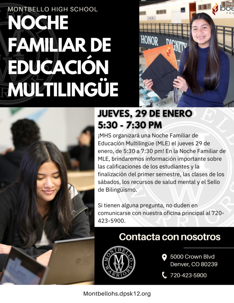 MHS will be hosting a Multilingual Education (MLE) Family Night on Thursday, January 29th from 5:30 to 7:30pm! At MLE Family Night, we will be providing important information about student grades and completing the first semester, Saturday School, mental health resources and the Seal of Biliteracy.
