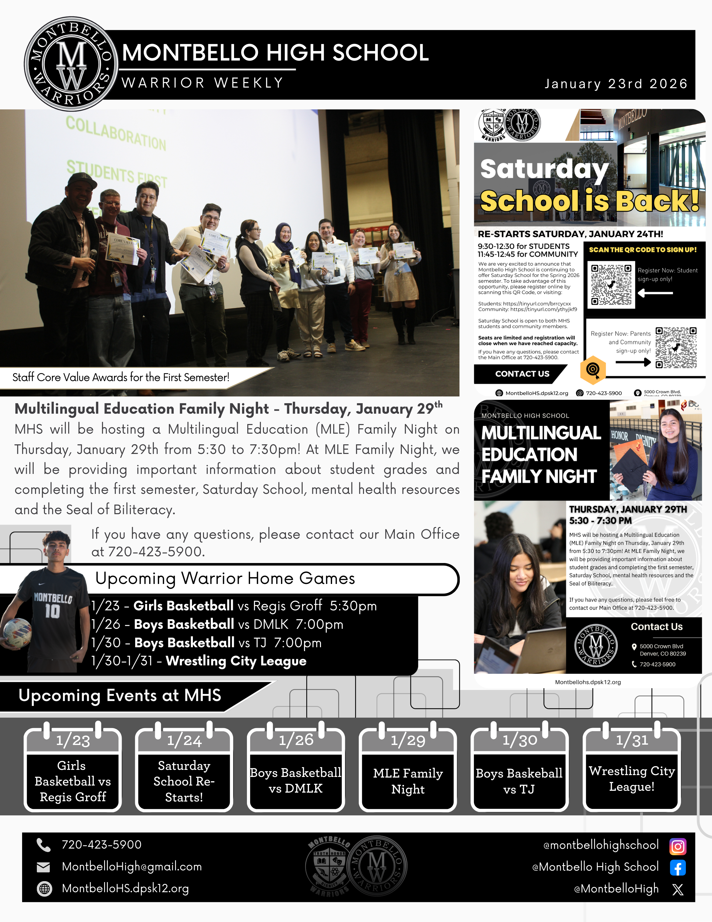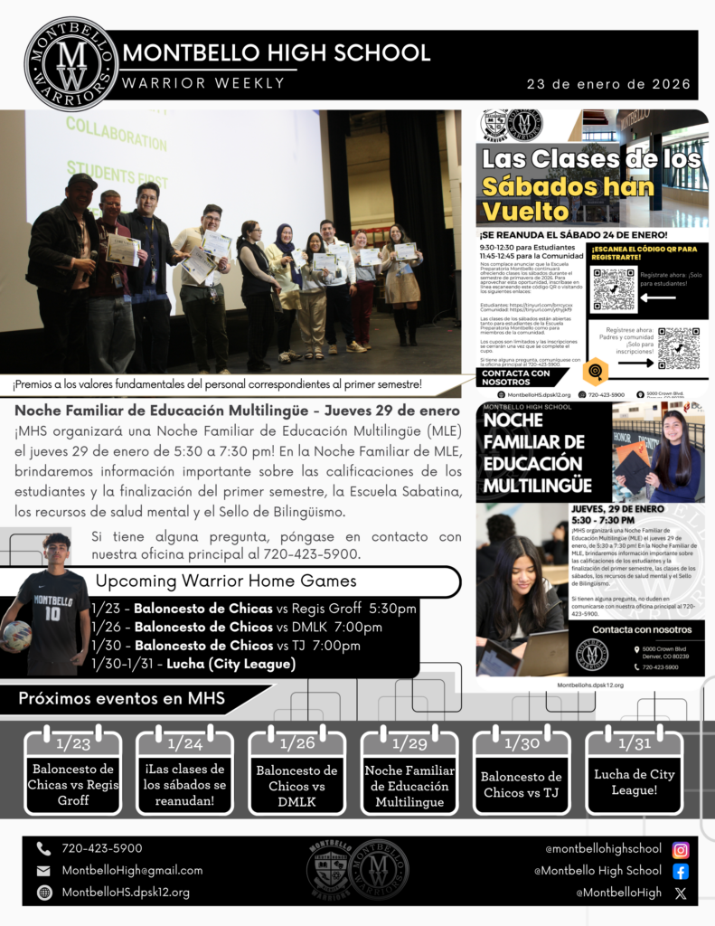 MHS will be hosting a Multilingual Education (MLE) Family Night on Thursday, January 29th from 5:30 to 7:30pm! At MLE Family Night, we will be providing important information about student grades and completing the first semester, Saturday School, mental health resources and the Seal of Biliteracy.