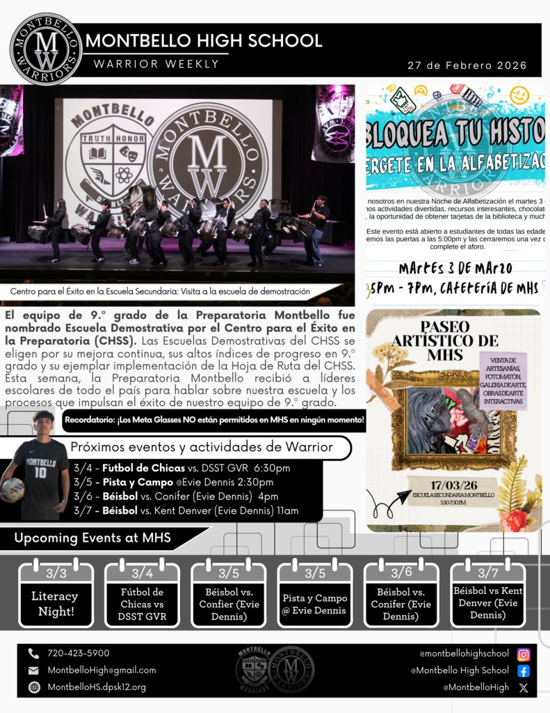 El equipo de 9.º grado de la Preparatoria Montbello fue nombrado Escuela Demostrativa por el Centro para el Éxito en la Preparatoria (CHSS). Las Escuelas Demostrativas del CHSS se eligen por su mejora continua, sus altos índices de progreso en 9.º grado y su ejemplar implementación de la Hoja de Ruta del CHSS. Esta semana, la Preparatoria Montbello recibió a líderes escolares de todo el país para hablar sobre nuestra escuela y los procesos que impulsan el éxito de nuestro equipo de 9.º grado.
