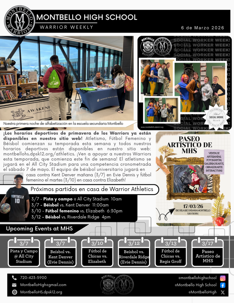 ¡Los horarios deportivos de primavera de los Warriors ya están disponibles en nuestro sitio web! Atletismo, Fútbol Femenino y Béisbol comienzan su temporada esta semana y todos nuestros horarios deportivos están disponibles en nuestro sitio web: www.montbellohs.dpsk12.org/athletics. ¡Ven a apoyar a nuestros Warriors esta temporada, que comienza este fin de semana! El atletismo se jugará en el All City Stadium para una competencia cronometrada el sábado 7 de mayo. El equipo de béisbol universitario jugará en casa contra Kent Denver mañana (3/7) en Evie Dennis y fútbol femenino el martes (3/10) en casa contra Elizabeth!