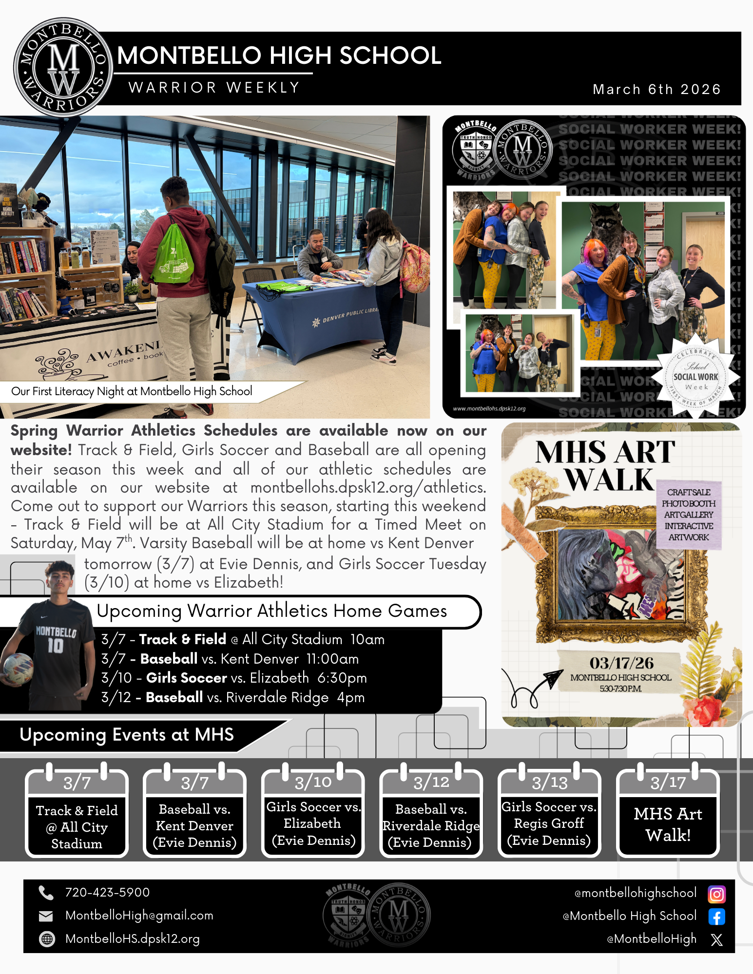Spring Warrior Athletics Schedules are available now on our website! Track & Field, Girls Soccer and Baseball are all opening their season this week and all of our athletic schedules are available on our website at www.montbellohs.dpsk12.org/athletics. Come out to support our Warriors this season, starting this weekend – Track & Field will be at All City Stadium for a Timed Meet on Saturday, May 7th. Varsity Baseball will be at home vs Kent Denver tomorrow (3/7) at Evie Dennis, and Girls Soccer Tuesday (3/10) at home vs Elizabeth!